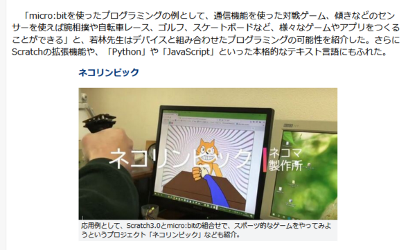 杉浦学先生著、阿部和広先生監修の書籍で、micro:bit連携の例としてご紹介を頂きました。(Scratch3.0版、日経BP)